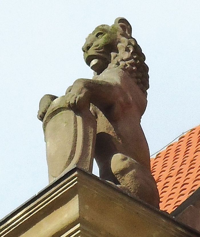 przykładem zastosowania pełnoplastycznego motywu lwa na elewacji jest