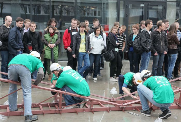 W strugach deszczu na dziedzińcu Politechniki Wrocławskiej osiem politechnicznych drużyn składało mosty. Walczyli w Studenckim Konkursie Mostów Stalowych.