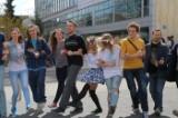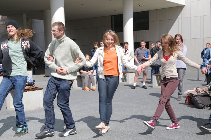 Kalina Zych dodaje, że Dni Tańca na PWr mają zachęcić studentów do aktywności fizycznej. – Taniec jest bardzo przyjemnym sposobem na rozruszanie się. Sama tańczę od 11 lat i chciałam moją pasją zarazić innych, świetnie się składa, że równocześnie na uczelni trwa Tydzień Zdrowia – mówi koordynatorka. Taneczny flash mob rozpoczął się o godzinie 13. Na dziedzińcu przed budynkiem D-21 najpierw pojawili się przedstawiciele samorządu studenckiego i sympatycy, a potem dołączyli pozostali. W sumie około 50 par. - Kolega mówi, że ma zaraz kolokwium z analizy matematycznej, niech zostanie z nami, u nas nie ma żadnych całek, tylko liczenie do trzech – zachęcał didżej, prowadzący flash moba. Studenci najpierw wykonali wspólnie taniec belgijski, a potem jeszcze zorbę. - O akcji dowiedziałam się z facebooka - mówi Paulina z Wydziału Mechaniczno-Energetycznego. - Super się tańczyło, kroki były bardzo łatwe, ale trochę się zasapałam. - Komu mało, niech weźmie udział w naszych Dniach Tańca – zachęcali organizatorzy. Na środę zaplanowano targi w Strefie Kultury Studenckiej, na których wrocławskie szkoły tańca zaprezentują swoją ofertę dla studentów. – Będą konkursy i spotkania z choreografami – zapowiada Kalina Zych. – Od dzisiaj można już zapisywać się też na warsztaty taneczne. Przygotowaliśmy zajęcia z różnych stylów, od tańca towarzyskiego, po street dance. Warsztaty odbędą się 23 i 24 kwietnia od g. 16 do 21 w SKS-ie. Więcej informacji o Dniach Tańca na profilu facebookowym wydarzenia. ISZ
