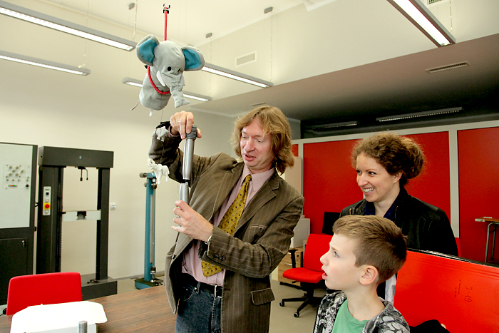Ile słoni można powiesić na linie? I dlaczego huśtawka nas utrzymuje? – pytały dzieci ze Szkoły Podstawowej nr 12 we Wrocławiu w laboratorium badań wytrzymałościowych Wydziału Mechanicznego. Było to jedno z pierwszych spotkań Dolnośląskiego Festiwalu Nauki na PWr. - Tytuł pokazu „Ile słoni można powiesić na drucie?” wymyślił kierujący Laboratorium Badań Wytrzymałościowych Wydziału Mechanicznego Dariusz Bąkowski – wyjaśnia prowadzący pokaz Dariusz Chruścielski. – Miałem jednak dużą swobodę w dobieraniu przekazywanych treści. Te zależały od mojej inwencji i od tego, kto przyjdzie na spotkanie. Teraz mówiłem do dzieci 8-, 9-letnich, którym trzeba było wyjaśniać rzeczy bardzo proste, choćby to, gdzie żyją i co jedzą słonie. Na następne pokazy przyjdą gimnazjaliści, więc może uda się nam zrobić więcej eksperymentów. Dzieci dowiedziały się, że dorosłe słonie ważą nawet 200 razy więcej niż one. Odkryły, że wszystkie przedmioty spadają na ziemię dzięki sile grawitacji. – O, spadł mi długopis? No, to musi leżeć, póki go sam nie podniosę, bo nie ma takiej siły, która by go uniosła bez mojego działania – tłumaczył Chruścielski. - Żeby pasażer huśtawki z niej nie spadł, podtrzymująca ją lina musi być wystarczająco mocna, a siła potrzebna do utrzymania dziecka czy zwierzęcia zależy od jego masy i naprężenia liny. Gdy masa jest za duża lina pęknie. Uczniowie zobaczyli, jak w czasie powiększania naprężenia metalowa próbka najpierw się wydłuża, a potem pęka. – Ojej, pękło! A to nie był nawet ciężar dorosłego słonia, tylko młodego, dwie tony – dziwił się Adrian. – U nas można się dowiedzieć, jak zrobić huśtawkę dla słonia, żeby z niej nie spadł. Jeśli kiedyś będziecie tutaj studiowali, dokładnie się tego nauczycie – śmiał się Grzegorz Chruścielski. ml