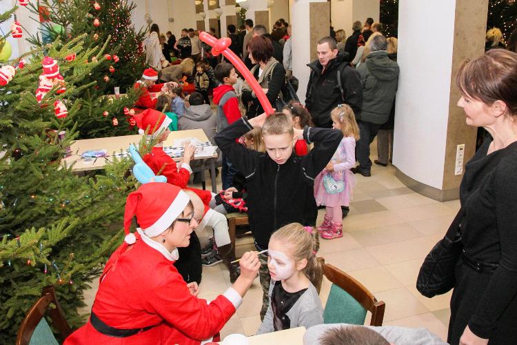 Tłum uśmiechniętych dzieci – tych większych i tych całkiem małych, czekał w sobotę na Mikołaja. W końcu święty Mikołaj przyjechał… Polinką, kolejką linową Politechniki Wrocławskiej! W holu gmachu głównego PWr rozpakował wór pełen prezentów. Znalazły się w nich słodycze dla wszystkich politechnicznych dzieci. - Mikołaj pytał mnie, czy byłam grzeczna i czy myję zęby. Ma długą brodę i czerwony płaszcz. Nie bałam się go, chociaż mówił bardzo głośno. Dostałam dużą torbę z ciastkami i cukierkami. Jest bardzo ciężka, dlatego do domu zaniesie ją tatuś - opowiadała pięcioletnia Ania. Dzieci, które czekały w kolejce po upominek, chętnie korzystały z okazji pomalowania buzi w wymyślne wzory. Dzięki świątecznemu makijażowi zamieniały się w kolorowe motyle, pszczółki i kwiaty. Dostały również zwierzęta, zrobione z balonów. – Pani zrobiła mi zielonego pieska, ale zacząłem się bawić i balonik pękł. Teraz czekam na czerwoną myszkę – mówił czteroletni Antek. Nie lada atrakcją było przedstawienie w auli PWr, przygotowane przez firmę Pani Teatrzyk z Wrocławia. Dzieci wspólnie z Mikołajem, Czerwonym Kapturkiem i strachem na wróble śpiewały, tańczyły i szukały zaginionych prezentów. O 11 wszyscy z niecierpliwością czekali na iluzjonistę – doktora Jędrzeja Bukowskiego, do niedawna pracownika PWr. Magik pokazał dzieciom, że czarować może każdy. – Pan pił i pił wodę z misek, a po chwili ona znowu w nich była. Widziałam też, że wielkie pudło unosi się w powietrzu, a z płonącej chusteczki powstaje nagle róża – wyliczała siedmioletnia Amelka. Aneta Podolska z Działu Socjalnego PWr: - Cieszymy się, że mimo brzydkiej pogody pracownicy naszej uczelni zdecydowali się przyjść ze swoimi dziećmi na politechniczne mikołajki. Jeszcze nie policzyliśmy, ile paczek zostało odebranych. Te, które zostaną, przekażemy do domów dziecka. Małgorzata Jurkiewicz